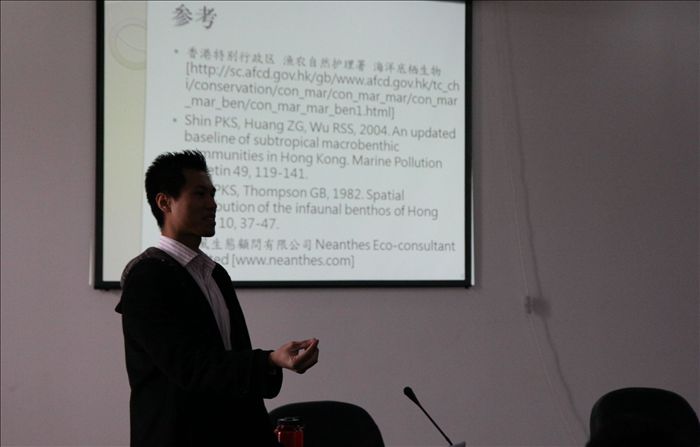 林伟业老师就采用底栖生物群落特征分析进行环境评估的方法作了深入简出的解说,并结合香港海域底栖生物调查的多个实例对此方法的应用作了生动的解说。报告结束后,现场的研究生们结合各自所参与研究的具体情况踊跃问题,与林老师进行了很好的交流和讨论。林老师也对本院研究生的学习钻研精神作了高度的评价。
