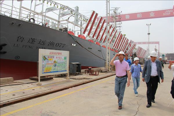 2013年6月16日,我院朱清澄教授赴山东蓬莱京鲁集团考察了该公司正在建造的77m秋刀鱼生产船“鲁蓬远渔077”。公司董事长王轰热情接待了朱清澄教授一行。