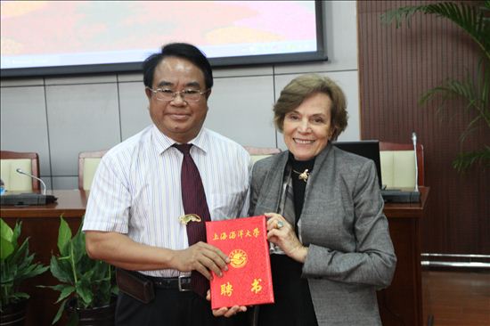 上午9:30,Sylvia Earle 博士首先从我校黄硕琳副校长手中接过聘书。随后,她给学校师生们作了“可持续海洋:远景与现实”的学术报告,回答了师生们的很多提问。中午黄硕琳副校长代表海洋大学宴请了Sylvia Earle 博士。下午,Sylvia Earle 博士与深渊科学技术中心的研究人员座谈,对中心的发展思路和中心完成的11000米载人潜水器的概念设计给出了她的咨询意见。这次来校访问得到了上海电视台国际频道(ICS)的重视,他们派人对Sylvia Earle 博士的全天活动作了记录拍摄,并对她作了专访。