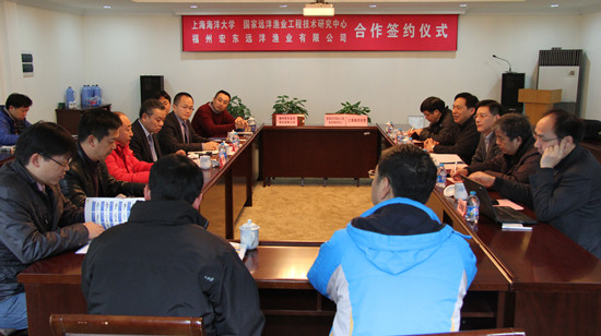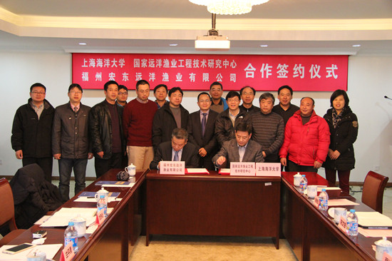 2014年12月28日,上海海洋大学、国家远洋渔业工程技术研究中心与福州宏东远洋渔业有限公司合作签约仪式在军工路校区农业部远洋渔业培训中心会议室召开。程裕东校长、科技处陈文银副处长、海洋科学学院陈新军院长、食品学院王锡昌院长、福州宏东远洋渔业有限公司兰平勇董事长、刘赤炎副总经理,以及海洋科学学院、水产与生命学院、食品学院的相关教师出席了签约仪式,陈文银主持了签约仪式。