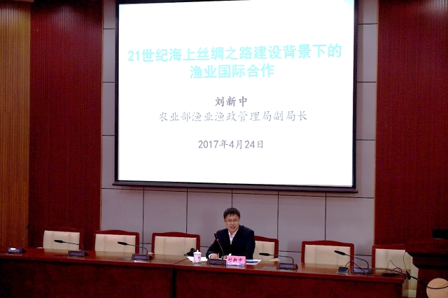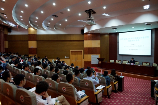 2017年4月24日下午2时,农业部渔业渔政管理局刘新中副局长在行政楼137报告厅作了题为21世纪海上丝绸之路建设背景下的渔业国际合作的报告。报告会由海洋科学学院院长陈新军主持,海洋科学学院教师和研究生参加了报告会。