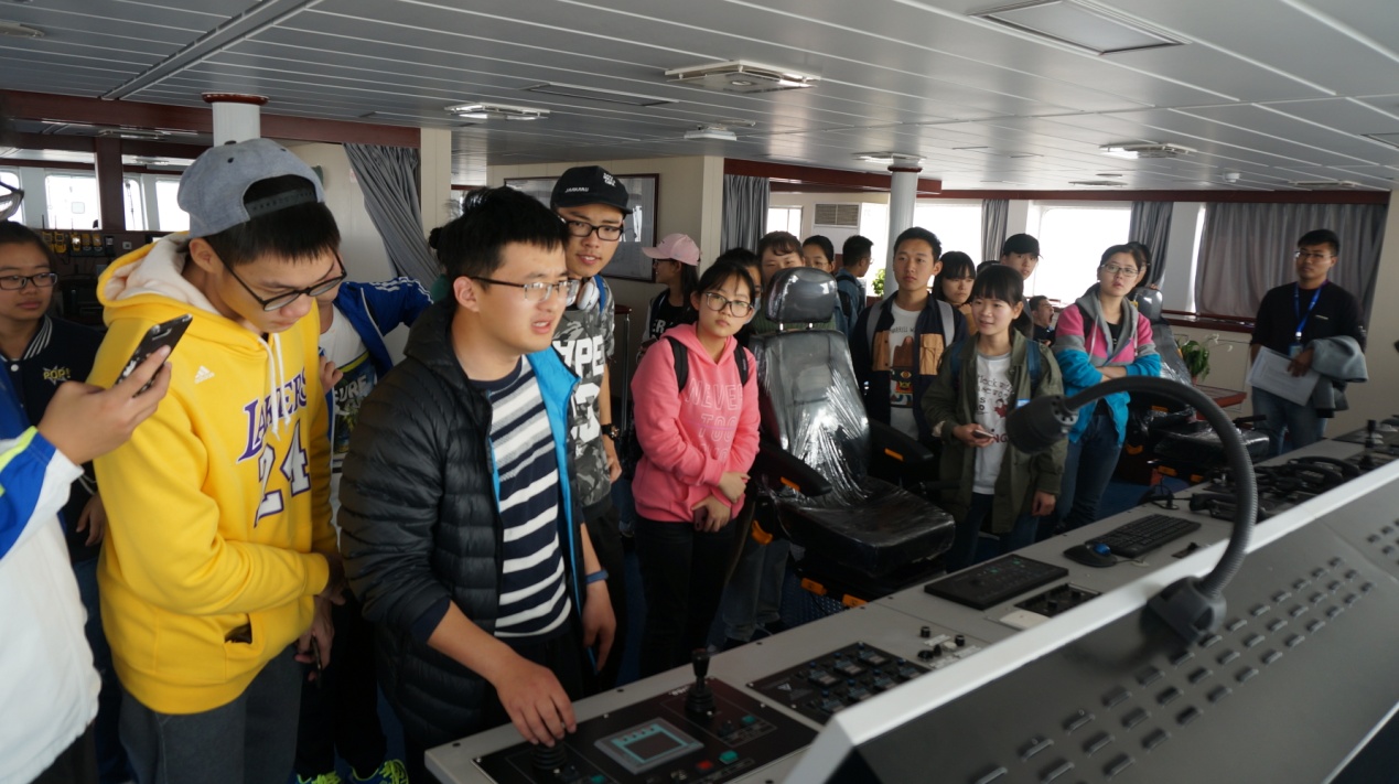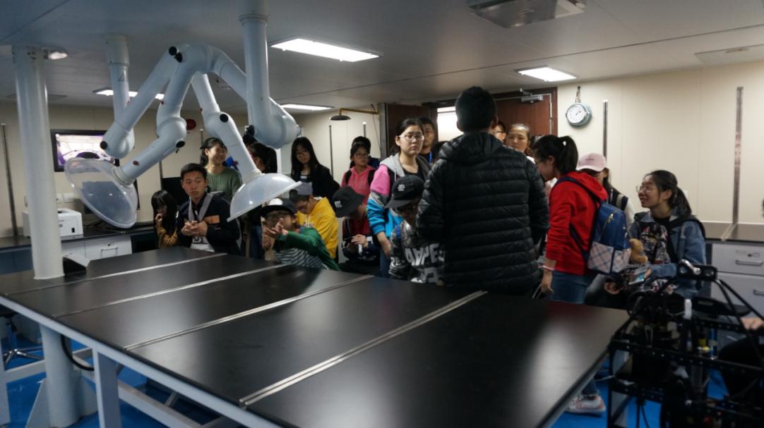在带队老师们的带领下,同学们开始走进船内去探索“淞航”号的内部设备和构造,这也正是解答同学们疑惑的地方——“淞航”号将会用来做什么工作。带队老师首先带领学生们进入了淞航号的操控室,给大家介绍每台设备的功能。接着同学们又参观了休息室和食堂,整齐而干净的环境,让同学们对于船上的生活又有了一番新的印象。从食堂出来后,他们又参观了船上的四个实验室。