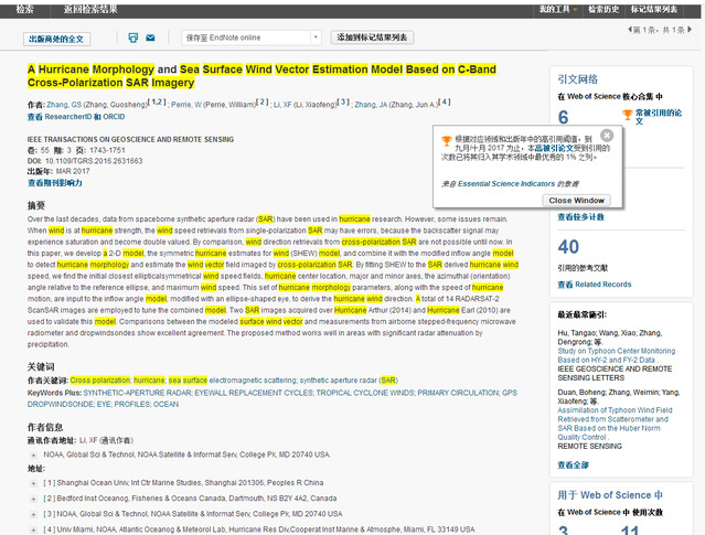 据ESI(Essential Science Indicators)的最新数据显示,以我校为第一单位,我院张国胜博士后为第一作者、上海海洋大学国际海洋研究中心李晓峰特聘教授为通讯作者,发表于国际顶级期刊《IEEE TRANSACTIONS ON GEOSCIENCE AND REMOTE SENSING》的论文《A Hurricane Morphology and Sea Surface Wind Vector Estimation Model Based on C-Band Cross-Polarization SAR Imagery》入选“地球科学”领域ESI-Highly Cited Papers,这是我院首次入选ESI高被引论文。