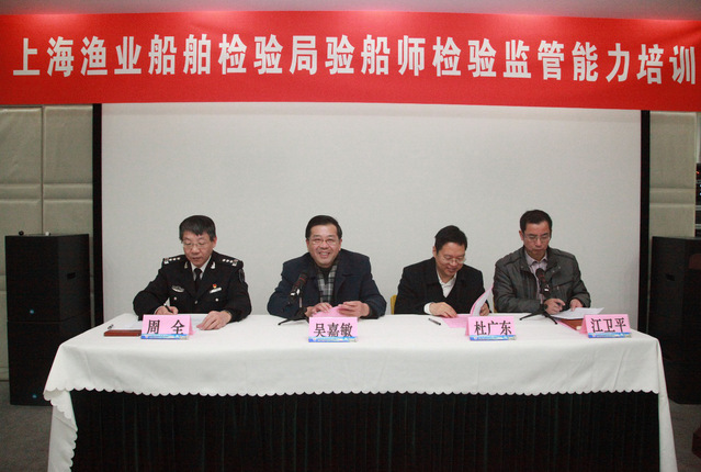 2018年1月15日上午在上海海洋大学图文中心406,隆重举行了上海渔业船舶检验局验船师检验监管能力培训班开班典礼。农业部渔业船舶检验局法规监督处杜广东副调研员,上海渔业船舶检验局周全局长、倪军副局长,上海海洋大学党委书记吴嘉敏教授出席了本次典礼,典礼由海洋科学学院党委书记江卫平主持。