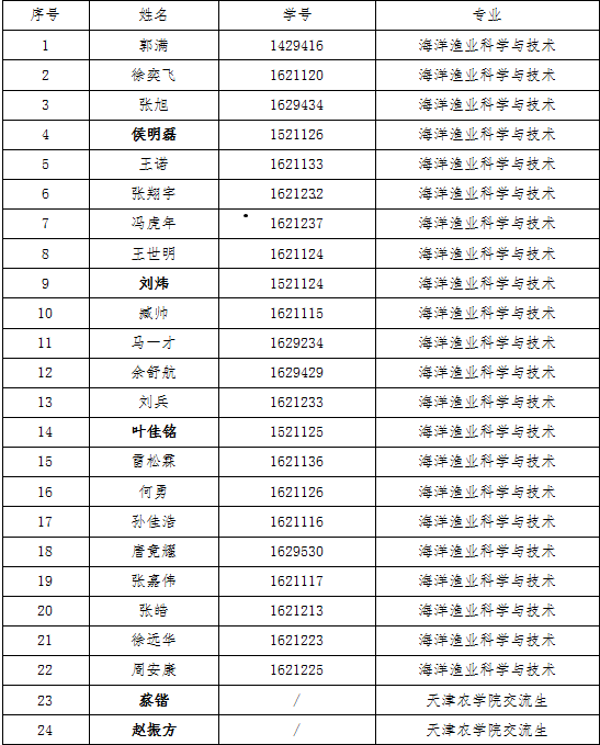 根据远洋渔业学院“上海海洋大学远洋渔业学院2018年招生通知”,由学生自愿报名,家长同意,经过远洋渔业学院理事会单位(中国水产有限公司、上海水产集团有限公司和上海海洋大学)组成的面试小组面试,通过三甲医院的体检。远洋渔业学院理事会最终审议确定2018年远洋渔业学院预录取学生名单如下: