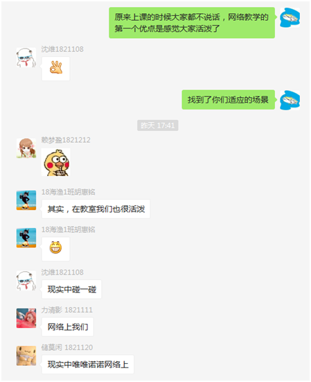 “渔业海洋学”作为海洋渔业科学与技术专业的专业必修课,现有三名教师授课,研究领域各有侧重。在原先的教学模式中,大家按照教学日历的安排依次独立授课,几乎不可能出现同堂讲授的情况,而现有模式可令三名教师一同参与授课和讨论话题,针对不同的提问进行相互补充回答,使学生获取更加系统的知识输入;第二,聊天记录可以帮助教师追溯已发生的教学过程,即使某位教师有事不能参与即时讨论,也可以通过翻看记录了解教学进度,并进行补充发言;第三,我们这个课程由一名老师和两名新教师组成,这种在线教学模式在某个程度上也是新教师对于老教师授课的观摩,对于累积教学经验、提高教学技巧都具有良好的促进作用。