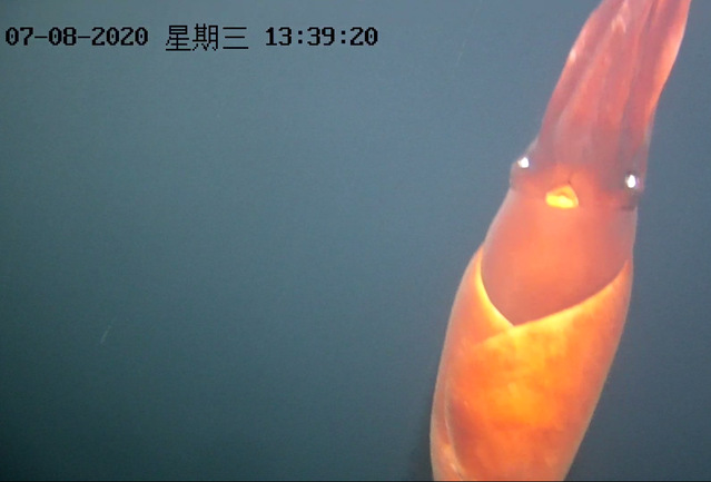图3 潜水器在水下观测到的深海鱿鱼(深度约600米)