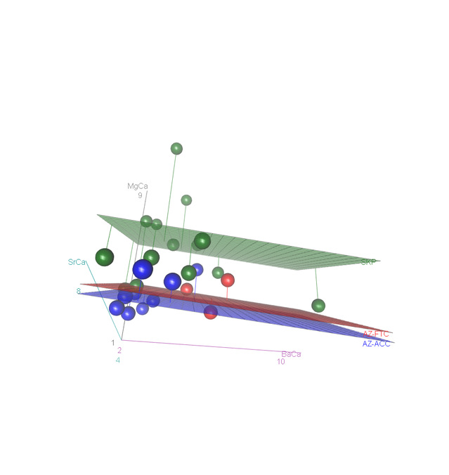 在此基础上,研究团队对东南极凯尔盖朗海台周边水域南极电灯鱼耳石微化学开展研究。在结合物理海洋学、生物海洋学以及鱼类生物学与生态学等学科知识,研究团队分析了南极绕极流主要锋面——南极绕极流南锋、南极绕极流南界、南极陆坡锋以及凯尔盖朗海台本地的小鹿海槽流对南极电灯鱼种群的隔离作用,并进一步探究环极深层水(Circumpolar Deep Water,CDW)对南极电灯鱼生活史过程产生的影响。研究结果表明,结合南极电灯鱼耳石微化学与采样区域的海洋学环境数据,可以确定不同属性水体的南极电灯鱼耳石微化学特征,耳石微化学特征信息可作为南极电灯鱼种群结构划分的标记。研究结果进一步显示,南极陆坡锋有效地将南极绕极流流域与南极陆坡区域的南极电灯鱼种群隔离开来,而南极绕极流流域与凯尔盖朗海台上的南极电灯鱼种群结构存在较为明显的差异,并由此推断凯尔盖朗海台存在南极电灯鱼自我维持的产卵场和产卵群体。耳石中镁钙元素比值(MgCa-1)为南极电灯鱼种群划分提供了良好的化学标记(图3)。研究团队认为,在南极绕极流管控南大洋生态系统的背景下,鱼类耳石微化学技术有助于解析南大洋鱼类种群结构的异质性以及环极连通性,并进一步在阐析南极海洋生物-物理相互作用上发挥作用,有效拓宽了生物海洋学的研究范畴。评审专家对该研究给出了极高的评价,“该研究为影响凯尔盖朗海台南侧水域南极电灯鱼种群结构和连通性的生物-物理参数提供了令人兴奋的探索,为当地海洋学提供了极好的背景知识,也为所设定的假设提供了先进的生物-物理验证”。