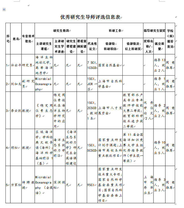 根据《上海海洋大学全面落实研究生导师立德树人职责实施细则》和《上海海洋大学优秀研究生导师评选办法(试行)》等文件精神,经个人申请、学院评定专家组审定,海洋科学学院对拟推荐的上海海洋大学2020年度优秀研究生导师名单予以公示如下:
