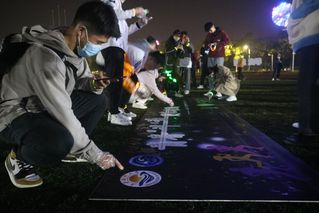 活动开始,109名参与学生到签到处签到,领取了荧光手环,并在工作人员的引导下,用荧光颜料在“签到板”上留下了自己的印记。