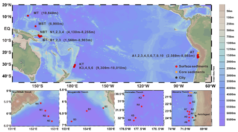 黑碳(blackcarbon)是生物质和化石燃料不完全燃烧的产物,直接影响到全球气候变化、碳循环、环境健康危害等诸多问题,是当前国内外气候和环境等研究领域共同关注的热点(图1)。尽管海洋很早就被认为是重要的黑碳碳汇,但关于深海黑碳的研究报道还比较少,对深渊沉积物的黑碳更是从未报道过。研究团队利用学校深渊中心组织的海沟航次和国际合作者的共享航次,获得了阿塔卡马、克马德克、新不列颠、布干维尔、玛索和马里亚纳等六条海沟的沉积物样品(图1)。课题组分析了黑碳和总有机碳含量及其稳定和放射性碳同位素(δ13C和Δ14C),获得了3个重要发现。(1)海沟沉积黑碳是来自陆地植被和化石燃料的贡献而不是海洋来源,该发现基本解决了近年来学术界关于大洋黑碳是陆地来源还是海洋自生来源的争论。(2)生物质和化石燃料对海沟黑碳的贡献比例与海沟距离陆地的距离、附近国家的植被分布以及社会经济活动水平有关。在靠近欠发达国家巴布亚新几内亚的新不列颠海沟和布干维尔海沟,植被燃烧的平均贡献超过50%;而在靠近发达国家澳大利亚和新西兰的克马德克海沟以及附近有明显采矿活动的阿塔卡马海沟,化石燃料燃烧的贡献可超过80%(图2)。(3)基于六条海沟估算得到全球深渊黑碳年埋藏量为1.0±0.5×106吨,该值是前人估算的深海黑碳埋藏量的两倍。这意味着,早期对深渊的忽视很可能大大低估了深海的黑碳碳汇潜力。