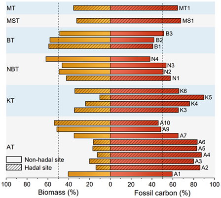 化石碳和生物质燃烧对六条海沟表层沉积黑碳的贡献百分比