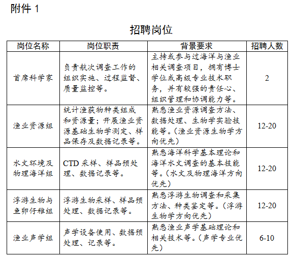 根据2023年度公海渔业资源调查项目工作需要,经研究,按照公开招聘、择优录用的原则,拟公开招聘一批科考队员。有关事宜公告如下。