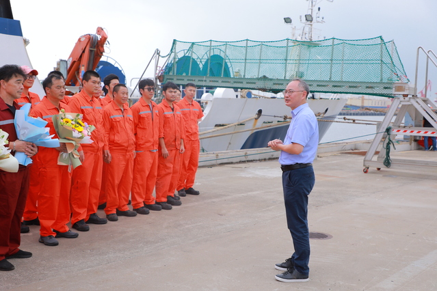 倪卫杰对科考人员致以崇高的敬意和亲切的问候。倪卫杰指出,本航次在生产安全、捕捞渔获和科考调查等方面取得的圆满成功,离不开上海海洋大学师生付出的艰苦努力。航次结束正值中秋国庆佳节,倪卫杰亲切地嘱咐大家好好休养身体,养精蓄锐后再接再厉完成好后续工作。此次科考调研,为西太平洋公海渔业资源的可持续开发、科学管理提供重要依据,为远洋渔业的高质量发展提供科技支撑。