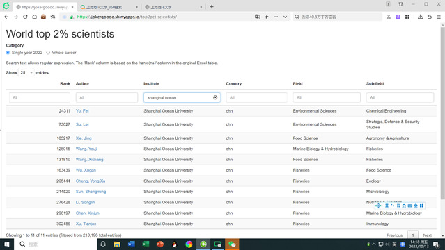 近日,美国斯坦福大学发布了2023年“全球前2%顶尖科学家榜单”(World’s Top 2% Scientists 2023)。我院陈新军教授入选“2022年度科学影响力排行榜”。