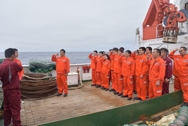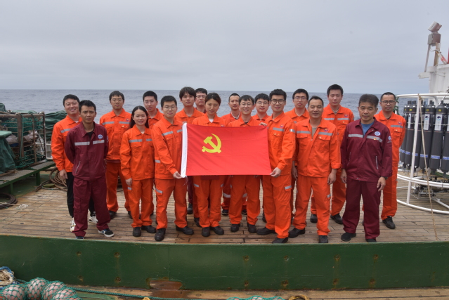 7月1日,伴随激昂国歌声,正在执行2024年度西太平洋公海渔业资源综合科学调查的二十余名党员和科考队员庄重肃穆,鲜艳的五星红旗从“淞航”号上冉冉升起,这是“淞航”号临时党支部开展升旗仪式。面对党旗,船上二十余名党员进行了庄严的重温入党誓词仪式。回到会议室,支部邀请了许建东船长、刘志良船长和叶旭昌领队讲述他们爱国荣校的出海故事,激励党员们初心不改,奋斗不息。