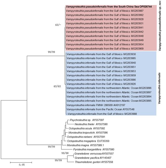 2016年9月,在海南岛东南海区800—1000米水深采集到一个类似幽灵蛸的标本(图1),经过其与幽灵蛸形态比对,发现二者在形态上存在着明显的差异,包括尾部的形态、下角质颚的形状、发光器的位置。同时,线粒体COI基因与核基因28S rDNA系统进化分析中呈现出两个遗传距离较大的分支,且具有较高的支持值(图2,3)。在此基础上,将南海采集的标本形态特征与历史报道的10个同物异名种的形态特征进行了系统的比较分析,确认南海采集到的标本与之前报道的同物异名种有着明显的差异。最终,我们确定采集到的标本为幽灵蛸属一个新物种,成为幽灵蛸目已知的第二个现存物种;并定名为拟幽灵蛸(Vampyroteuthis pseudoinfernalisQiu, Liu & Huang, sp. nov.)。