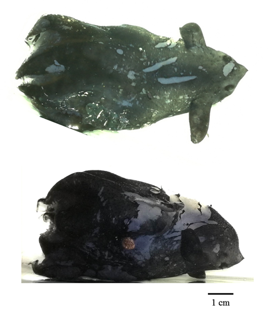 近日,中国科学院南海海洋研究所邱大俊研究员团队联合上海海洋大学海洋生物资源与管理学院刘必林教授团队,对海南岛东南海区深水800-1000米采集到一个与幽灵蛸相近的标本进行了系统的研究。通过形态学和基因的比较分析等,明确其与幽灵蛸存在明显差异,确定其是幽灵蛸目新种——拟幽灵蛸(Vampyroteuthis pseudoinfernalisQiu, Liu & Huang, sp. nov.)。相关研究成果已在线发表于分类科学期刊《Zoological Systematics》上。中国科学院南海海洋研究所邱大俊研究员为论文的第一与通讯作者,上海海洋大学刘必林教授是共同合作者之一。