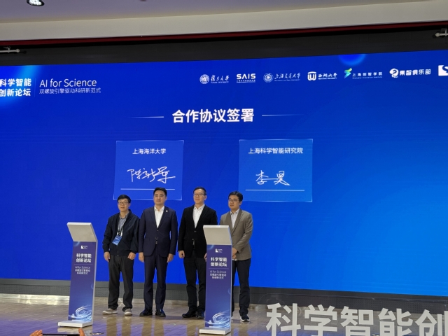 会上,陈新军代表上海海洋大学与上海科学智能研究院地球科学团队带头人李昊教授签订了合作协议,校党委书记王宏舟和上海科学智能研究院院长漆远共同见证了这一重要时刻。