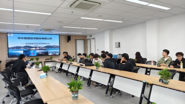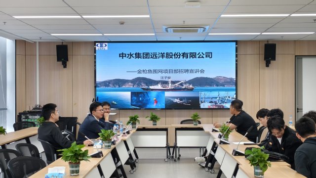 紧接着,汪子安副经理对金枪鱼项目进行了具体宣讲,内容涵盖了金枪鱼围网项目部的组织架构、业务范围以及金枪鱼行业的现状和发展前景。他通过生动的案例和图片,展示了金枪鱼围网作业的全过程,并播放了历届毕业生在中水集团一线工作的视频,使同学们对远洋渔业工作有了更加直观的了解。