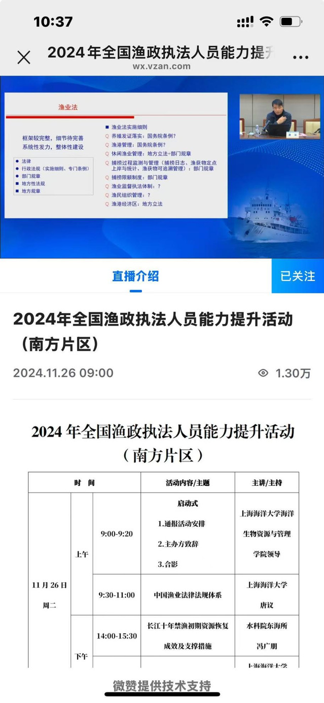 来自农业农村部渔业渔政管理局、农业农村部渔政保障中心、我国南方13个省级行政区的渔政执法骨干人员以及上海海洋大学、广东海洋大学、中国水产科学研究院东海水产研究所、上海市人民检察院第三分院、河北省石家庄市农业综合行政执法支队等单位专家共77人参与了线下活动,直播点击量达1.3万人次。