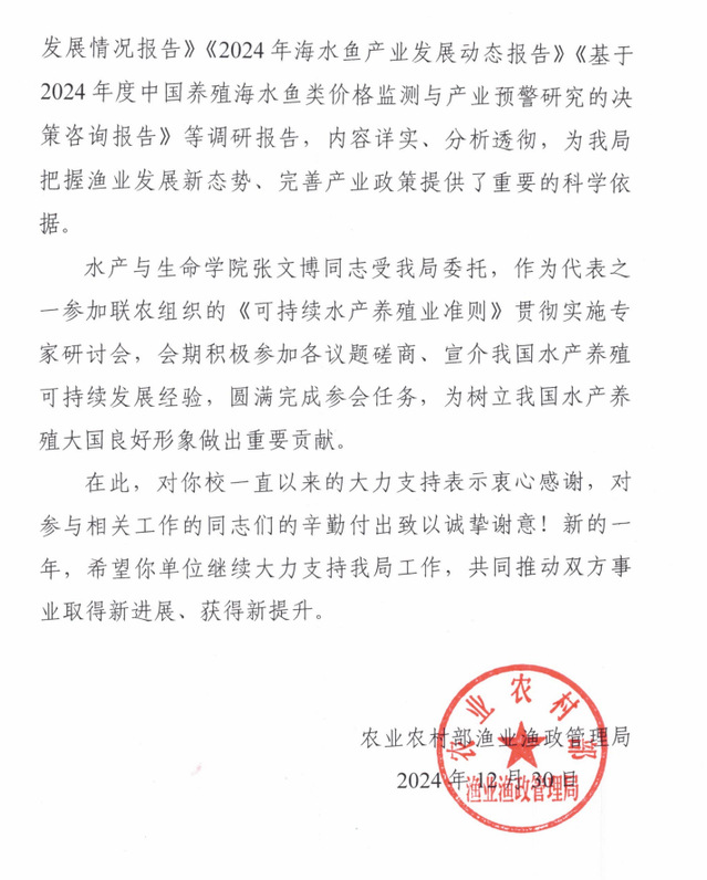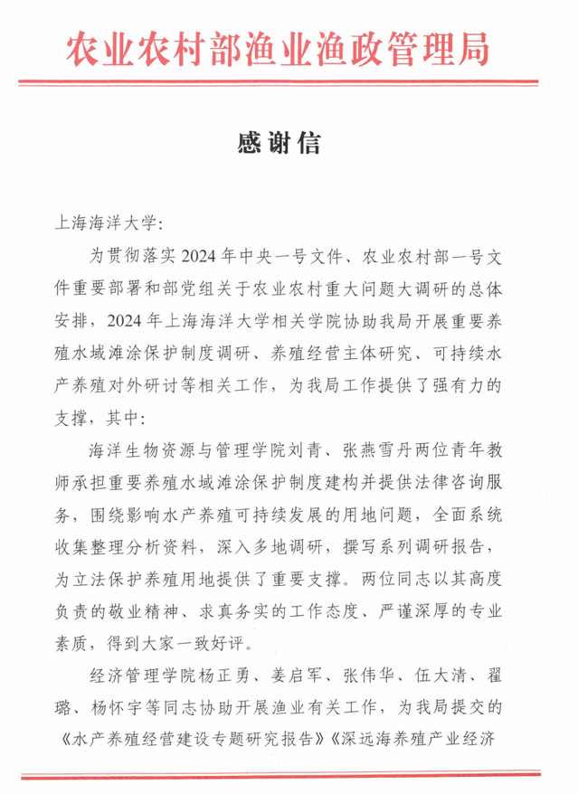 近日,学校收到农业农村部渔业渔政管理局发来的感谢信。感谢学校相关学院协助农业农村部渔业渔政管理局开展重要养殖水域滩涂保护制度调研、养殖经营主体研究、可持续水产养殖对外研讨等有关工作。对学校及海洋生物资源与管理学院刘青、张燕雪丹同志,经济管理学院杨正勇、姜启军、张伟华、伍大清、翟璐、杨怀宇等同志以及水产与生命学院张文博同志一并表示感谢。