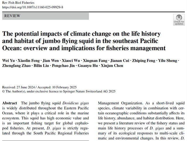 近日,上海海洋大学远洋渔业科学与技术创新团队陈新军教授课题组以“The potential impacts of climate change on the life history and habitat of jumbo flying squid in the Southeast Pacific Ocean: overview and implications for fisheries management”为题的综述论文在《Reviews in Fish Biology and Fisheries》期刊在线发表(图1)。该期刊是渔业科学领域的国际顶级期刊,为农林科学一区top期刊,影响因子为5.9,专注于发表鱼类生物学和渔业科学的高质量综述文章。