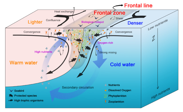 海洋锋面是位于全球上层海洋中的离散、普遍存在的海洋学特征,可以被认为是狭窄的三维边界,在相对较短的水平距离内,某些特性(如温度、盐度或叶绿素浓度等)会发生显著变化(图1)。锋面处的次级环流、辐聚效应及强混合等动力过程显著影响着海洋中的物质、能量输运与生态过程。海洋锋面在海洋动力过程、渔场学、海洋生态学等方面发挥关键作用,对渔业资源评估、渔场预测、污染物分布监测及海洋军事等方面具有重要应用价值。