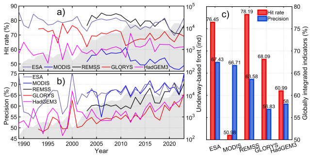 近日,上海海洋大学海洋生物资源与管理学院陈新军教授团队研究成果“A global daily mesoscale front dataset from satellite observations: In situ validation and cross-dataset comparison”被地学领域知名期刊《Earth System Science Data》(影响因子11.2,地球科学1区)正式接收。该研究将前期研发的锋面识别算法拓展应用于全球海域,结合全球范围内走航观测数据,对该算法及多种海表温度产品进行了系统的验证与比较分析,构建了首个全球高分辨率中尺度锋面数据集(https://doi.org/10.5281/zenodo.14373832)。该数据集自今年1月在全球公开发布以来,累计下载量已超过5.0 TB。
