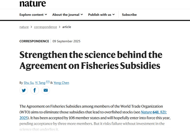 近日,我校海洋生物资源与管理学院讲师苏舒和唐议教授与美国纽约州立大学石溪分校陈勇教授合作,在国际顶级学术期刊Nature发表correspondence通信文章《Strengthen the science behind fisheries subsidies》。文章聚焦世界贸易组织(WTO)《渔业补贴协定》的落实问题,呼吁国际社会强化科学支撑与政策结合,为全球可持续渔业治理提供坚实基础。