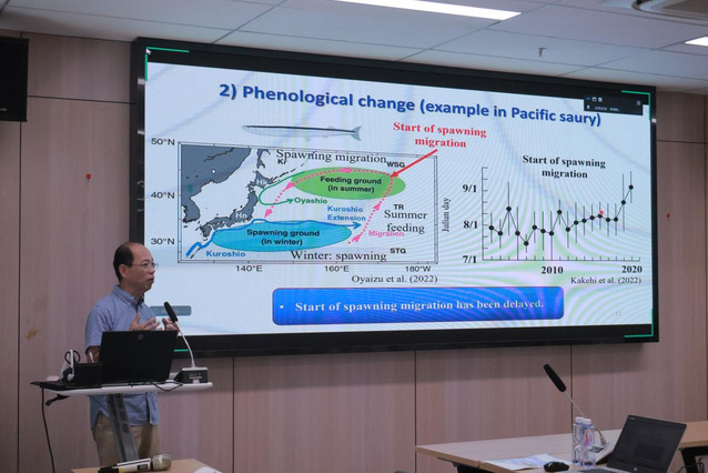 伊藤教授在主题报告中系统阐释了全球变暖对鱼类生物学与生态学的深远影响,并以西北太平洋鱼类体重变化为研究切入点,揭示了三大核心驱动机制。他强调,全球变暖正通过多重路径重塑海洋生态系统:首先是栖息地北移现象显著加剧,作为变温动物,鱼类因无法自主调节体温,其最适温度区间的变化正推动全球多数鱼种向极地迁移。其次是物候变化呈现复杂响应模式。全球变暖虽普遍导致物种春季水华、迁徙及产卵等季节性活动提前,这对种群补充机制的潜在威胁。第三是温度-体型规则的显著作用。暖化环境加速幼鱼生长周期并促使性成熟提前,最终导致成体体型缩小。伊藤教授的研究表明,驱动群体体型缩小的核心机制是气候变化,其导致的饵料资源减少加剧了鱼类种内与种间竞争。