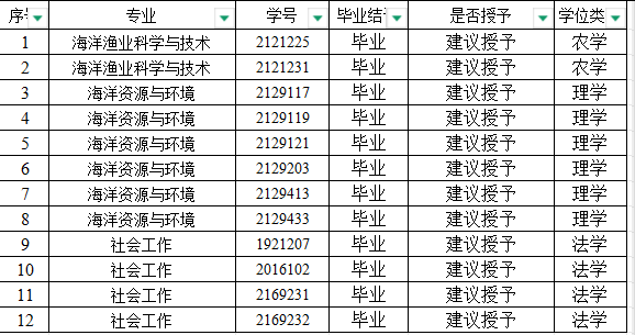 2025年5月30日海洋生物资源与管理学院学位评定分委员会会议至今, 我院2025届毕业生中原待定12人,已全部修满毕业要求的学分,获准毕业,并符合学士学位授予条件,建议授予学士学位: