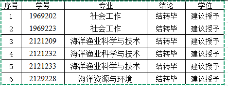 根据《上海海洋大学本科生学籍管理条例》和《上海海洋大学学士学位授予工作细则》之规定,经学院审核,现同意对我院2025年9月往届生结业转毕业之学位审核结论公示,名单如下: