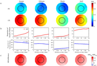 图2 1-4月涡旋中的HSI分布模态、涡旋内适宜HSI与距涡心距离的关系以及各月气旋涡与反气旋中的HSI差异比较