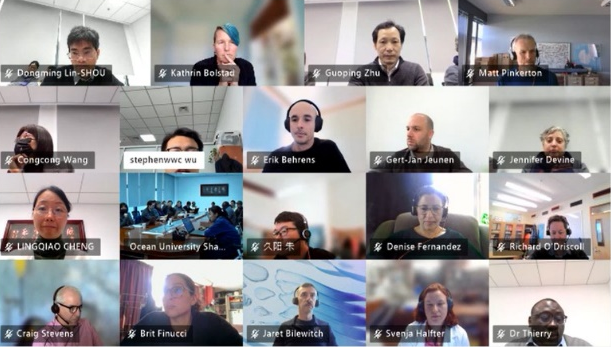 12月11日,由上海海洋大学主办的国家重点研发计划“政府间国际科技创新合作”重点专项“南极罗斯海区域渔业与气候变化的协同效应”项目第三次联合研讨会暨深化中国-新西兰南极海洋科学合作讨论会,以线上、线下相结合的方式在我校顺利举行。本次会议由上海海洋大学朱国平教授主持,并与新西兰地球科学研究院(ESNZ)詹妮弗·迪瓦恩(Jennifer Devine)博士共同召集。来自上海海洋大学、中国极地研究中心(中国极地研究所)、新西兰地球科学研究院、新西兰奥塔哥大学、新西兰惠灵顿维多利亚大学、新西兰奥克兰理工大学等单位的近50位专家学者参加了此次会议。上海海洋大学副校长江敏教授和海洋生物资源与管理学院副院长朱江峰教授参与会谈。新西兰与会方,新西兰地球科学研究院渔业领域旗舰项目主管理查德·奥崔斯科尔(Richard O'Driscoll)博士、未来海洋领域旗舰项目主管布里特·菲努奇(Brit Finucci)博士和责任科学家马修·平克顿(Matt Pinkerton)博士、新西兰惠灵顿维多利亚大学彼得·里奇(Peter Ritchie)副教授、新西兰奥克兰理工大学卡特琳·博尔斯塔德(Kathrin Bolstad)副教授等12位学者汇报了研究成果并参与讨论。