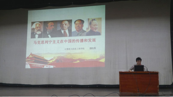 田仕兵老师面向全体同学作了《不忘初心,牢记使命——学习中国共产党百年辉煌》的专题报告,从马克思恩格斯的伟大理论贡献、第一个社会主义国家的缔造者列宁、新中国的缔造者毛泽东、邓小平在新时期的历史功绩和中国特色社会主义理论的发展等五个方面清晰地讲述了马克思主义在中国的传播、应用和发展。