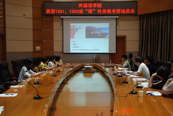 2018年5月17日19:00,1501、1502班“研”传身教考研动员会在校史馆思齐厅举办。校党委书记尚钢,外国语学院党委书记林二友,党委副书记占婧,团委书记向杨等人出席了本次活动。1502班班长石亿为主持人。1501、1502班学生全员参加。