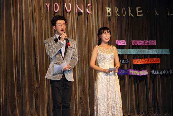 晚会共有四个节目,分别是由湖北大学各院教师子女友情出演的公益儿童短剧《手捧空花盆的孩子》、SOMA英语话剧团出品的话剧《窈窕淑女》、《蒂凡尼的早餐》和阳逻分会带来的《歌舞青春》。首先出场的是孩子们参演的《手捧空花盆的孩子》,简单的剧情衬托出孩子的稚嫩和无邪,台下的观众无不为孩童的纯真而感动。《窈窕淑女》经典重现,演员们精湛的演技,恰到好处的英式发音,完整精心的台词和配乐深入人心。台下观众的情绪都跟着剧情跌宕起伏,掌声雷鸣。《蒂凡尼的早餐》中演员们深厚的台词功底,巧妙的道具安排和娴熟的舞台风范使得整个话剧生动精彩。演员们感情充沛,每个观众都融入其中,身临其境。《歌舞青春》展现了青春的活力与激情。年轻的歌声,义无反顾的热情弥漫整个舞台。演员们精致的美式发音,别出心裁的歌、舞、表演结合的形式都在观众心中留下了深刻的印象。晚会最后,主持人道出:“青春是一场晚宴,我邀你一同赴约”。