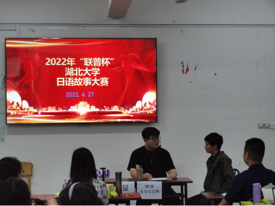 4月27日下午2:30,外国语学院日语系在逸夫人文楼A3002举行了2022年“联普杯”日语故事大赛。本次大赛由日语系的梁青、刘海燕、张静、黄凤琴、吕端、姜红、王辉、刘霞、唐芙蓉、张晶鑫十名老师及研究生李格、刘敏、胡卓颖共同担任评委。