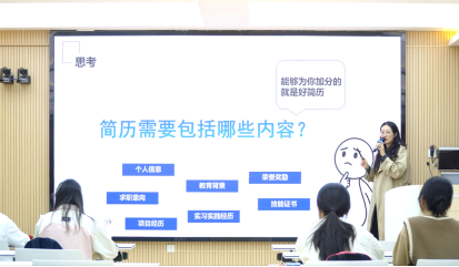 王嘉莹老师结合当前就业市场趋势,指出简历在求职过程中的核心作用。随后,她围绕简历结构搭建、具体内容提炼、个人亮点挖掘、格式规范要求等关键环节展开详细讲述。王老师通过剖析简历案例,让同学们更直观地看到简历的优化过程,深入浅出地讲解了一系列简历优化实用技巧。