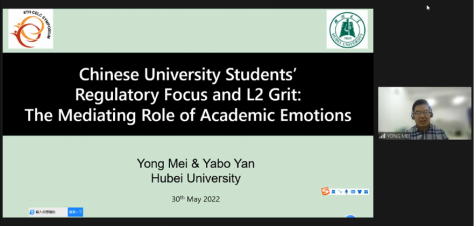 会上,梅勇老师与严亚波同学在“Teaching & Learning Strategies”板块分会场作20分钟主旨发言,共同介绍了他们的研究成果“Chinese University Students’ Regulatory Focus and L2 Grit: The Mediating Role of Academic Emotions”,并对与会学者提出的问题和困惑进行了解答和互动。