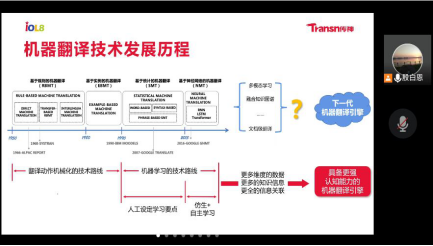 讲座第一部分,殷白恩老师简短的介绍了机器翻译技术的发展历程、人机共译落地的过程和AI当前发展阶段。殷老师告诉大家只有了解机器发展历程、人机共译的六大步骤及当前AI发展的阶段和未来发展走向,我们才能更加清楚未来要做的具体的事情。