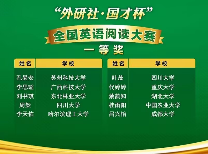 “外研社·国才杯”全国英语演讲、写作、阅读大赛是凭借其权威性、学术性和专业性,大赛自 2018 年起连续五年入选教育部中国高等教育学会发布的“全国普通高校大学生竞赛排行榜”。近年来,我院高度重视大学生创新创业,始终坚持“以赛促学、以学促能”的教学理念,将组织学生积极参加竞赛活动作为提升创新实践能力的重要途径之一,切实增强学生的创新素养和实践能力。